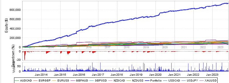 Der ACFX KI Trading Bot ist kein Schnellreichsystem, sondern ein strategisch entwickelter Handelsalgorithmus mit einem klaren Fokus auf langfristige Stabilität. Basierend auf dem aktuellen 10-Jahres-Backtest zeigt das System eine beeindruckende durchschnittliche Jahresrendite von rund 172 %, bei einem maximalen Drawdown von 20,5 % und einer Trefferquote von über 70 %. Diese Werte sind das Ergebnis einer breit gestreuten Portfolio-Strategie über mehrere Währungspaare, darunter besonders starke Performer wie EUR/USD, XAU/USD, NZD/USD und EUR/GBP.